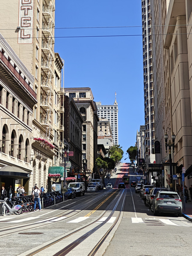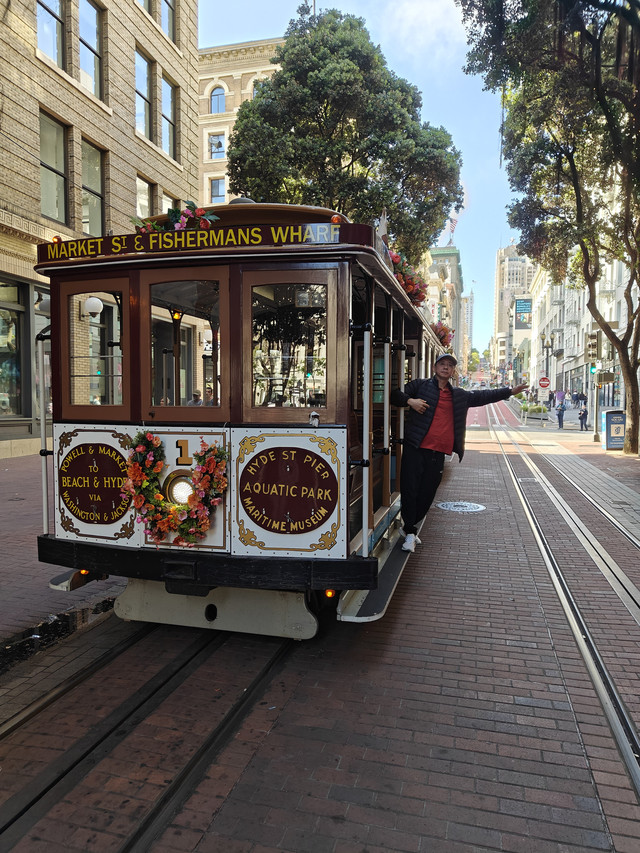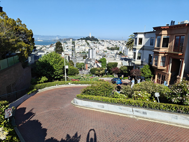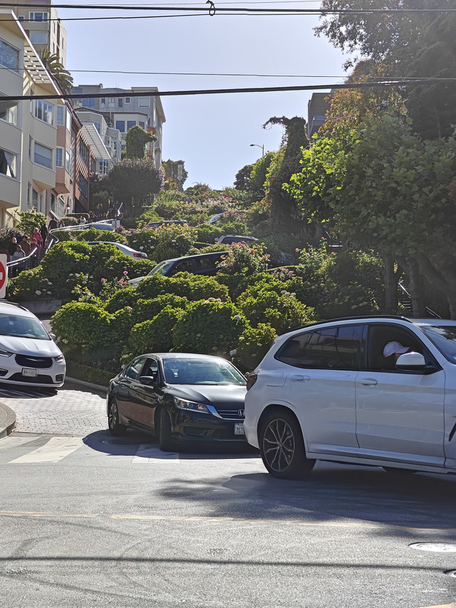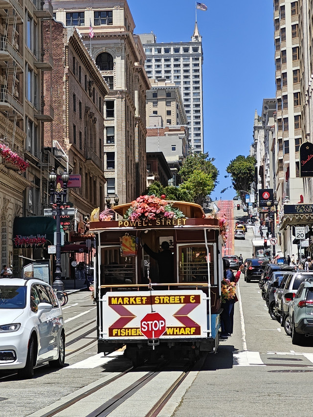 联合广场,附近街景,叮叮车,金门大桥(桥南岸的时候还是一层浓雾,大桥只能隐约看到一部分,过到北岸大桥竟展现了全貌),九曲花径(排队走这直线距离不足百米的路的车很多)。公交上车刷卡或applepay绑定的公交卡都是$2.5、投币$3,叮叮车$8。