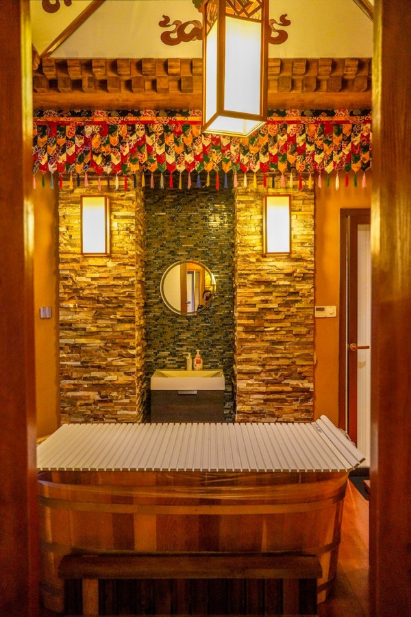 洗浴空间干湿分离、洗护用品、洗漱用品盒、肥皂垫等也是具有浓郁的藏羌风情设计,藏羌民族花纹点缀的浴袍颜值也很高。