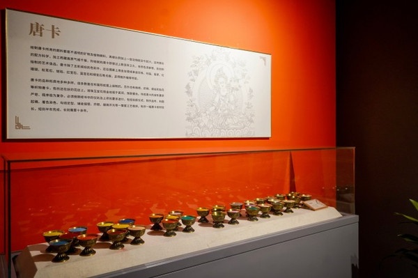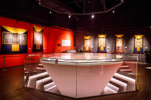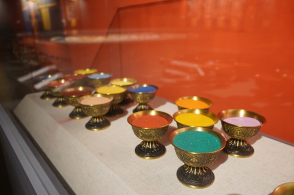 这个是镇馆之宝:彩砂坛城。彩砂坛城绘制,起源于 中国西藏 自治区 日喀则 市扎什伦布寺的传统美术,国家级非物质文化遗产之一。坛城源于 印度 佛教密宗,是藏传佛教密宗修行时供奉的对象之一。以七彩沙粒按严格的比例、结构、内容等堆砌而成,在台座上勾勒好轮廓后,由中心开始,方圆相间,逐渐向外围扩散绘制。除沙砌外,坛城还有手绘、木雕等不同的制作方式