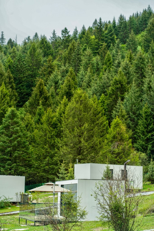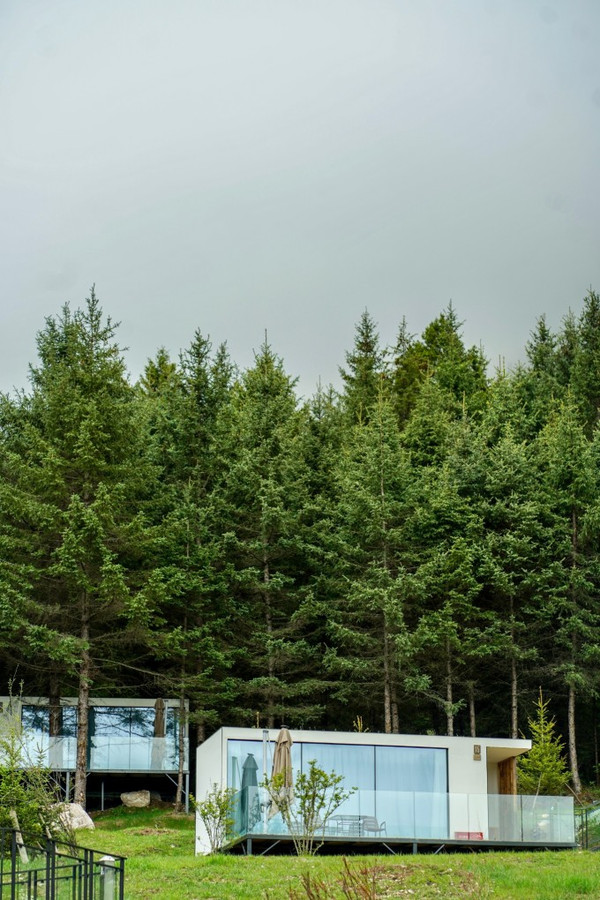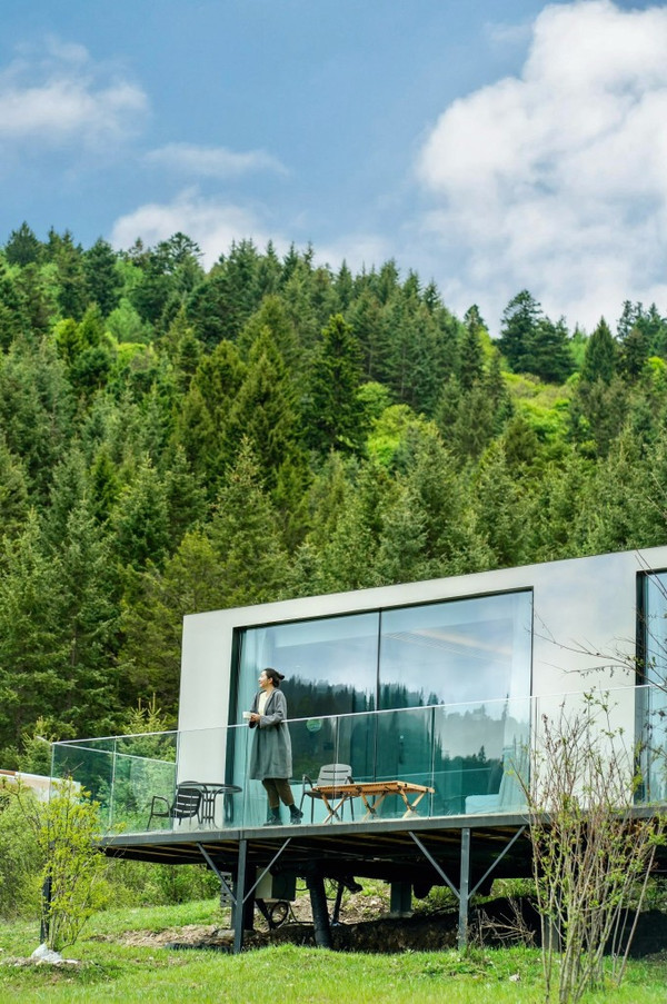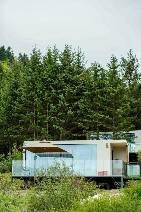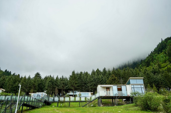 中查沟里有一个九寨森林地球仓,一个坐落在山坡上的集装箱酒店,房间错落在山坡上,与森林融为一体。