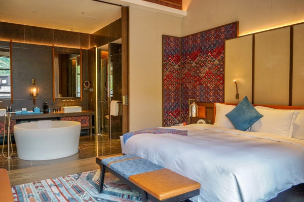 整个九寨英迪格酒店 有两百间客房及套房,房间的细节之处均能看见以羌族传统布艺刺绣及 阿坝 藏族独有的唐卡绘画形式。民族的就是世界的,客房床头背景墙的设计,主要采用藏羌服饰图腾装饰,花纹独特,色彩丰富,民族文化满满的设计带来别样的视觉冲击。