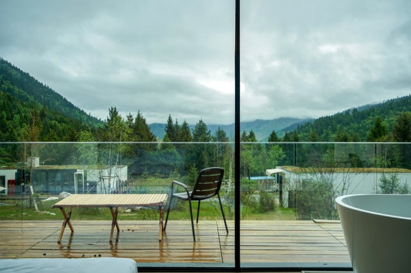客房高大的落地玻璃,可以远眺雪山林木,真正实现看得见风景的房间。