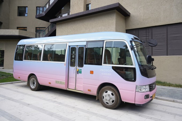 酒店门口停着酒店标志性渐变紫色的商务车。
