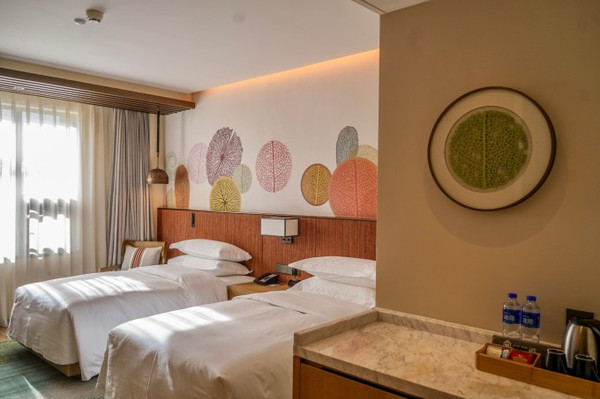 我们第一、二晚入住在九寨鲁能希尔顿花园酒店。这是一家四星级酒店。相比于其他五星级酒店,性价比比较高。酒店大堂设计灵感来源于 九寨沟 诺日朗瀑布,以气势磅礴的飞瀑迎接八方来客,将诺日朗瀑布灵动之美展现在眼前,令宾客仿若置身于 九寨沟 景点内,开启他们被绝美自然拥抱的梦幻旅程。