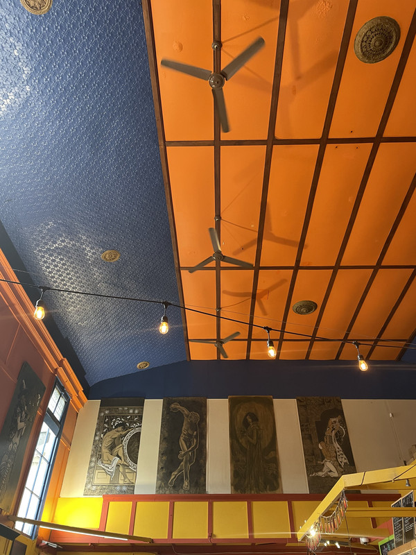 超爱这家的装修风格,整体橘色搭配一部分深蓝色屋顶,外加八九十年代美式风格大画报~