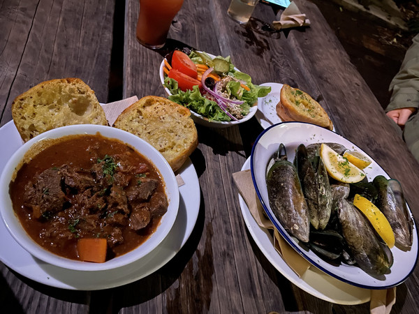最后的最后,我们第二天的晚上去吃了一家很有名的餐厅:Mussel Inn,这家餐厅在宣传小册子上宣传很多,当天中午特地打了电话去问要不要订位,店员告诉我直接去就可以,结果去了室内根本没有空位置了....人真的超多,而且大多是好多人一起去,户外倒是有位置,但是因为当天下雨,外面很冷,也没有暖风机,等餐等了半个小时不说,还被虫咬了几个包 ...我们点了一份炖羊肉,一份蒸鲜青口,个人感觉就是正常的西餐,没有让我惊艳的地方,说不话对我来说不太值得专门来排队吃,没有特别需求的朋友完全可以在正中心找地方吃饭,不同的时间还会有乐队驻唱,何乐而不为呢~来两张图看看~