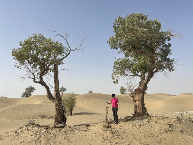 罗布人村寨,用塔克拉玛干沙漠做背景,用碧绿的塔里木河和千年胡杨林做衬托,对望连绵起伏