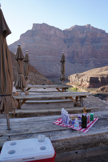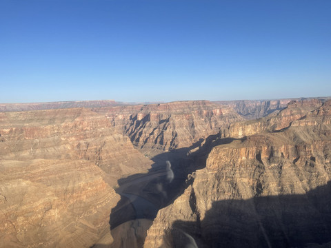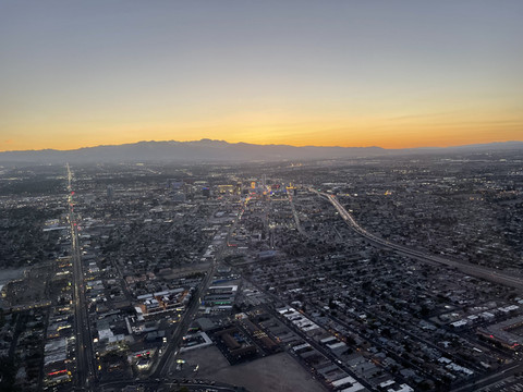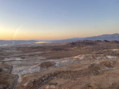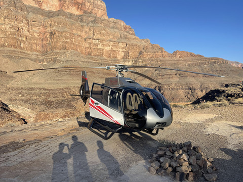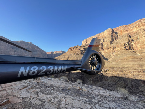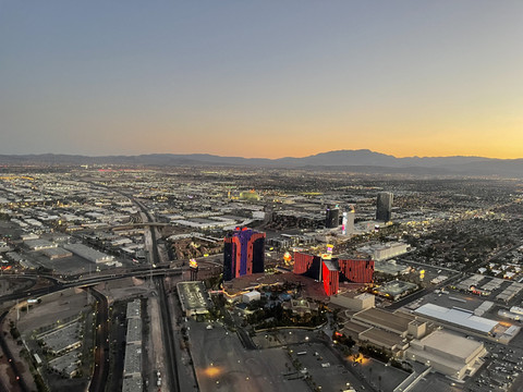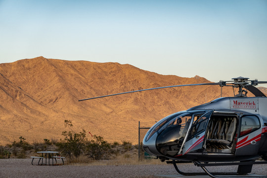 今天的重头戏是乘直升机游览大峡谷。我们之前在Maverick Helicopter预定了六人的大峡谷之旅,下午五点从拉斯维加斯机场起飞,飞跃胡佛水坝后继续深入大峡谷,在一个私人起降场降落后稍作休息,然后在夜幕中返航拉斯维加斯,全程大概三个半小时。票价是一人$499,不过考虑到可以在短短三个小时内空中游览这么多景点,以及中途提供的酒水点心,感觉性价比还是可以的,毕竟天上的观景和拍摄视角确实不错。下订单时填写住的酒店名字,到时候会有巴士接送。