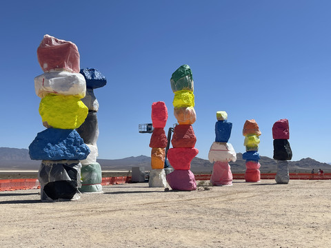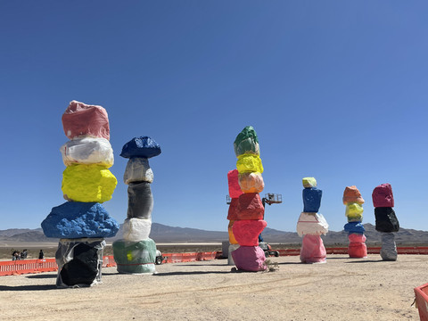 大家都拍照打卡后,接着继续向南开去Seven Magic Mountains,一组五颜六色挺有艺术感的石头。不巧正逢维修,便匆匆拍了几张照片后就继续赶路。