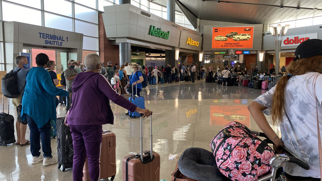 取好行李跟随标志走到接驳巴士乘车处。拉斯维加斯机场的租车中心在机场南面,与航站楼有一段距离,需要乘坐接驳巴士到达,车程大约10分钟。