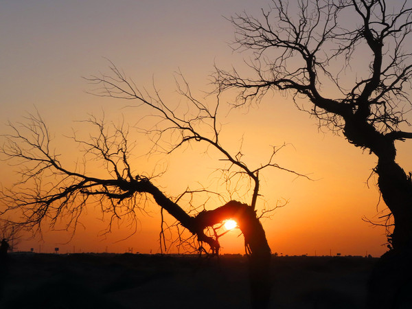 早餐后乘车赴额济纳,中餐后前往探寻古丝绸之路上保存最为完整的西夏古城遗址【黑水城、怪树林】,孤独、寂寞、不甘的倾诉,传说每年春风袭过之后沙漠迁移,走进古城中不时能捡到各种西夏时期的瓦片和发白的牛骨,在不久的将来也许会彻底的消失在历史的长河中。夕阳西下之际顺便观赏日月同辉的奇特景色,感受蔚蓝碧空之下金色荒漠戈壁悠悠。傍晚乘车返回小镇,入住酒店。