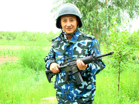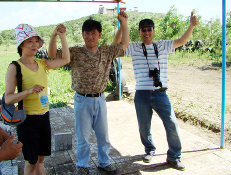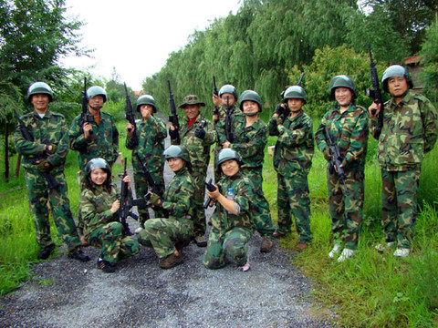 下午,在八一电影制片厂的外景地。车友们身着绿、兰两色的迷彩服,分组进行了动人心弦的CS实景军事对抗活动。
