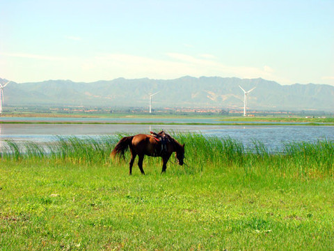 卧牛山紧依官厅水库,库中之水那一望无际的碧波,清澈而涟漪;特别是岸畔多座用于风力发电的巨大风车阵蔚为壮观。