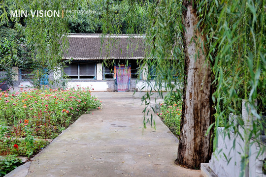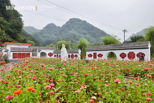 漫步村道,远远的就闻到了被灰瓦白墙包围的渊明园飘来的阵阵花香,穿过拱门,四四方方一处小花园,花园内矗立人像雕塑正是古代著名诗人陶渊明,群山之中另辟天地,此情此景,彰显田园诗人风雅气质!