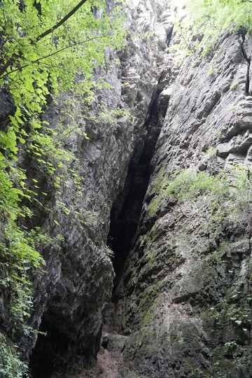 大裂缝,岩层垂直节理沿节理面岩石经风化作用垮落,再经流水冲蚀搬运形成。如果裂隙再扩展,就会形成“一线天”。