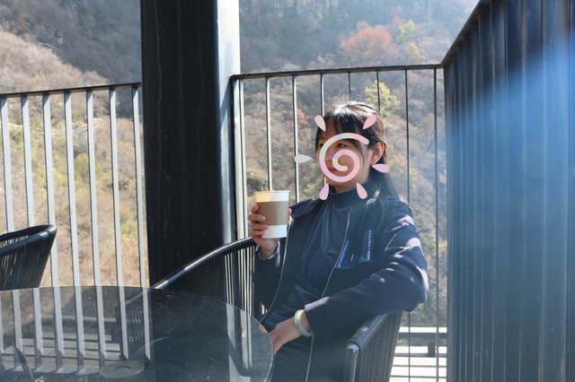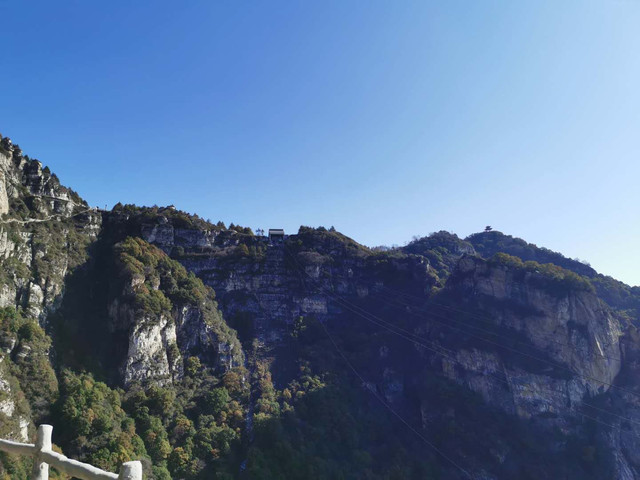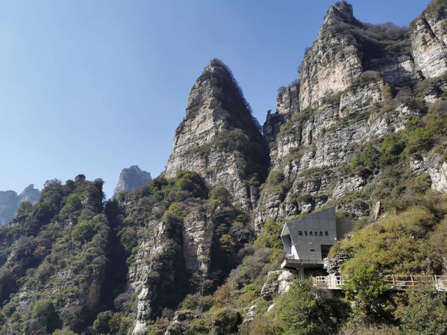 在韭菜园就可以看到往不同方向走的路标,找对方向我们便往绝壁长廊方向走,经过仙人晒靴,情人桥,到了自然角落云端咖啡,打卡云端咖啡厅,看看风景,拍拍照,补充体力,继续前行。游览三圣朝佛,太行之神等,乘坐飞云口上行索道,个人认为很有必要,虽然索道时间很短,但看下面的台阶很陡,凭我的体力步行不知道能不能上来。