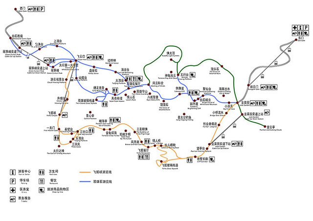 深度游环线:东门上山--韭菜园--飞狐峡--飞云口--双雄石--佛光顶--韭菜园,东门下山。