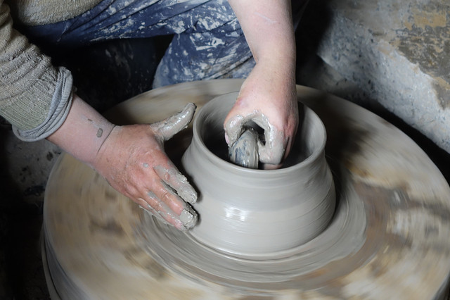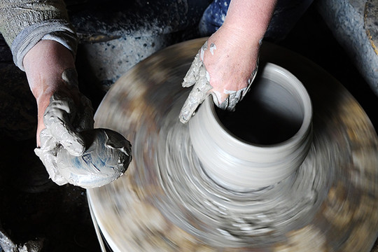 黑陶的捏制工序需要三个人通力合作,一人转轮,一人捏制,一人供料,只见轮轴高速转动,一滩软软的陶土,就在老师傅的巧手下成型了。