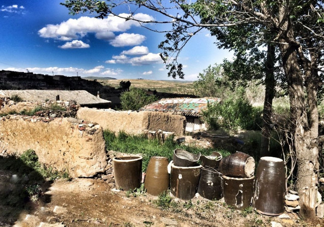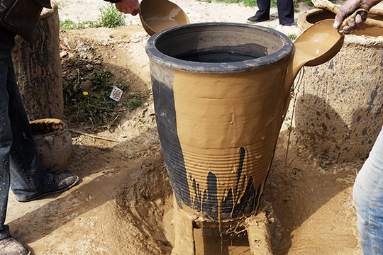 院子里正在进行上釉工序,将事先已经捏制好的瓮,用西沟特有的黄土做釉料,里外均匀的上好釉,进行集中晾晒。