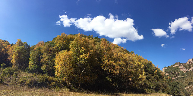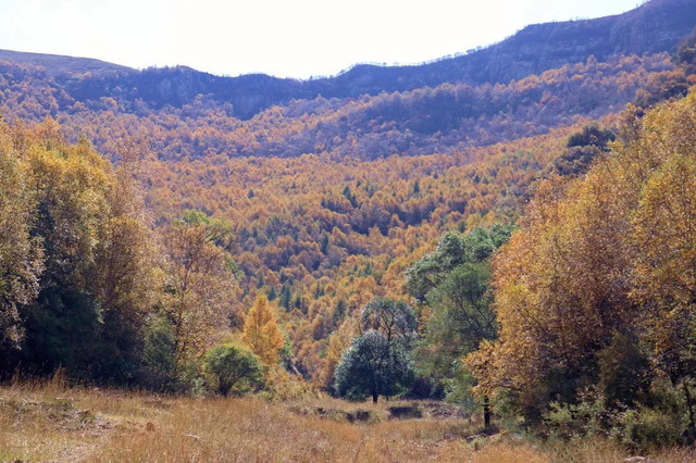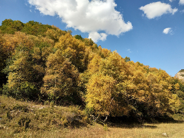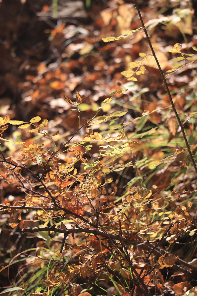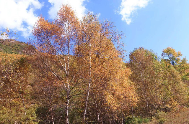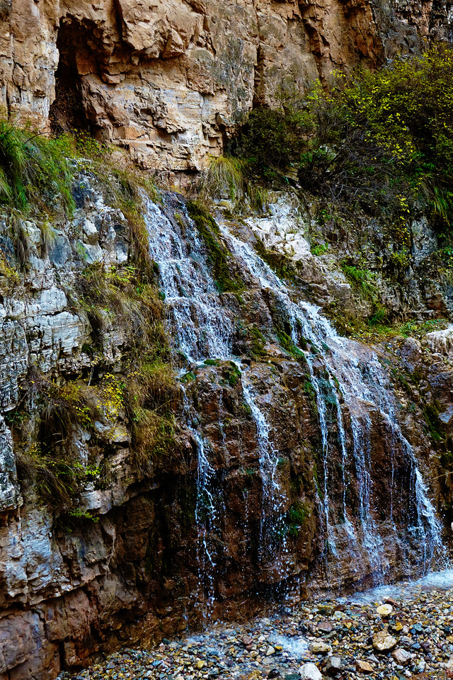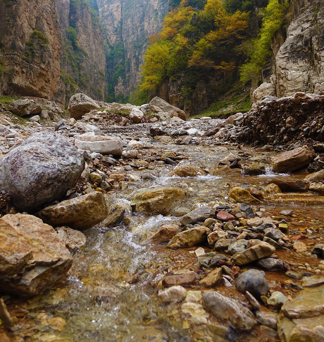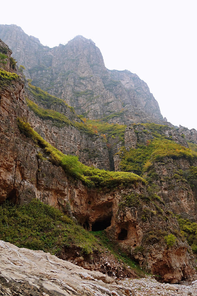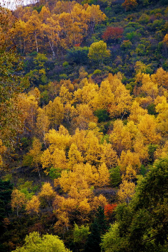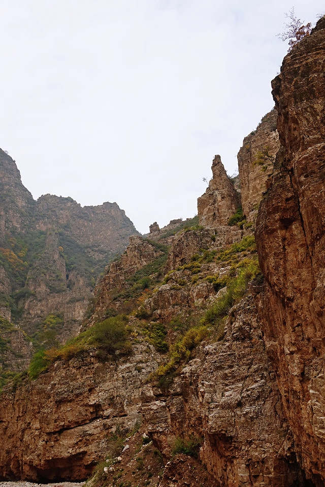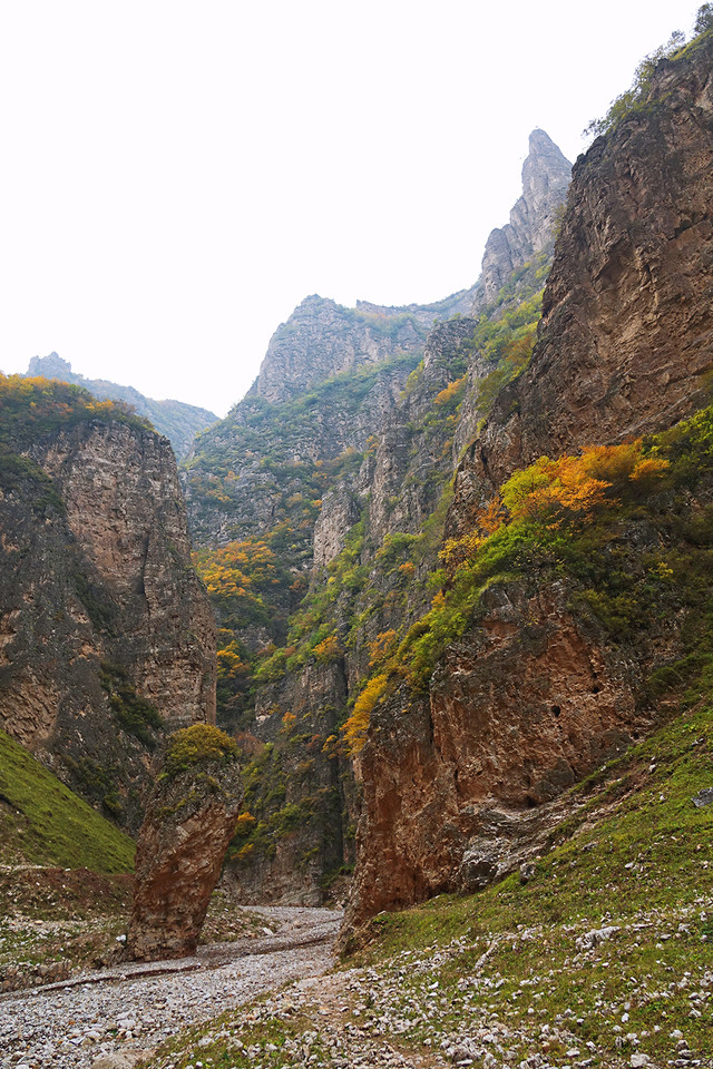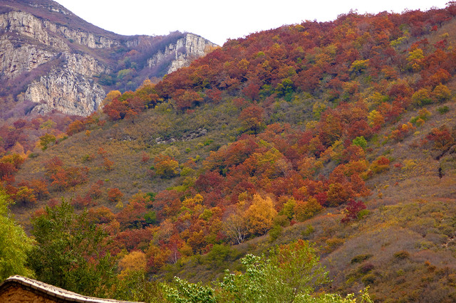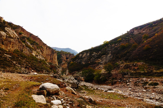 水峪峡谷的景色呈递进式,初入植被较少,因山势高,阻隔阳光,即使在秋天,植被也多为黄绿色。中段植被较多,秋色显得更加浓郁。等到了深处,会有大片的密林,漫山红、黄、绿交错,很是壮观。