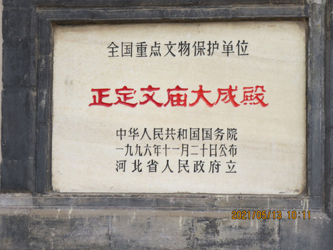 大成殿为国家重点文物保护单位,据著名古建筑学家梁思成先生鉴定,正定文庙内的大成殿与敦煌莫高窟壁画中的建筑极为相似,应为五代时期(公元907~960年)的建筑。比山东曲阜孔庙现存大成殿早很多,我看建筑都比较新,不象五代时期的。