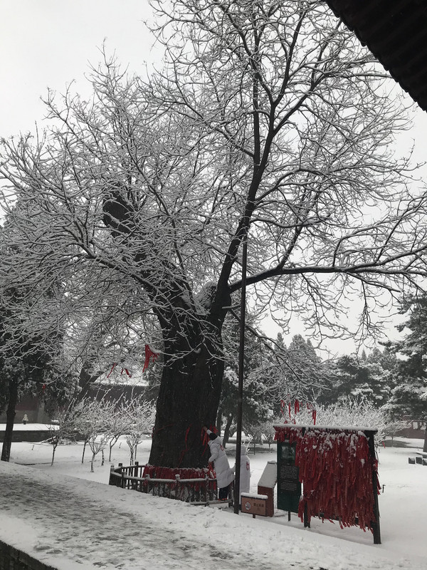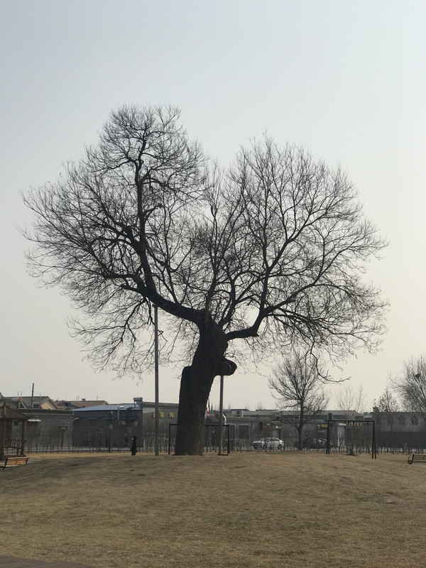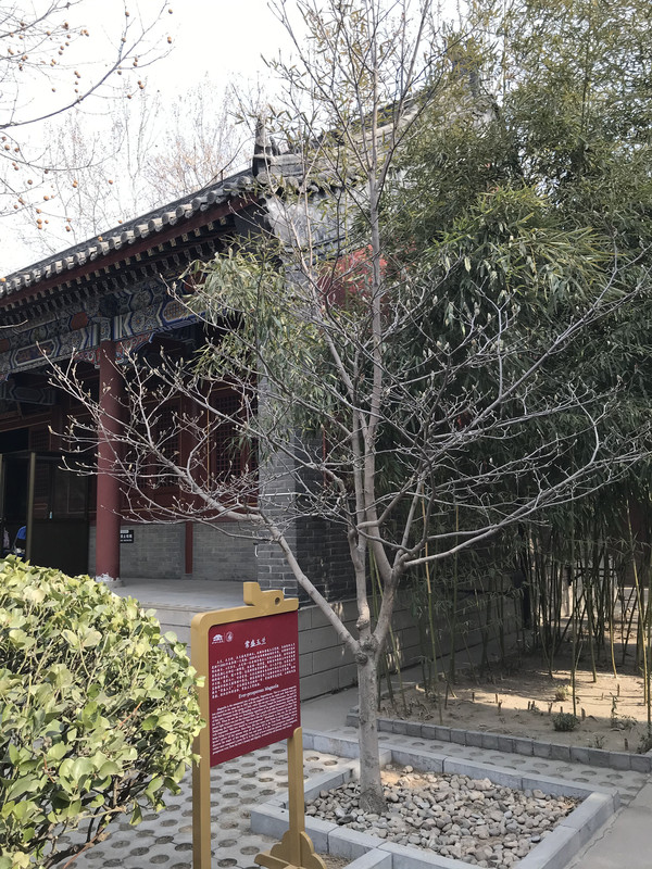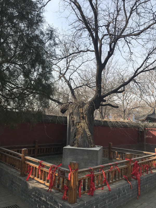 穿过小门,在甬道两侧各有一株寿龄一千六百余年的槐树,一为龙槐,一为凤槐。