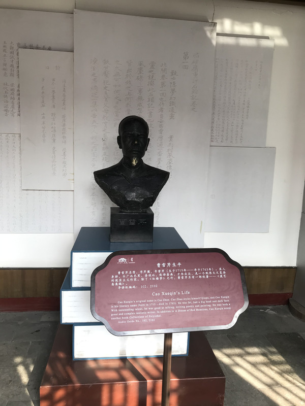 曹雪芹生平展厅内的曹雪芹雕像,像后有曹雪芹自题《石头记一绝》:“满纸荒唐言,一把辛酸泪。都云作者痴,谁解其中味?”