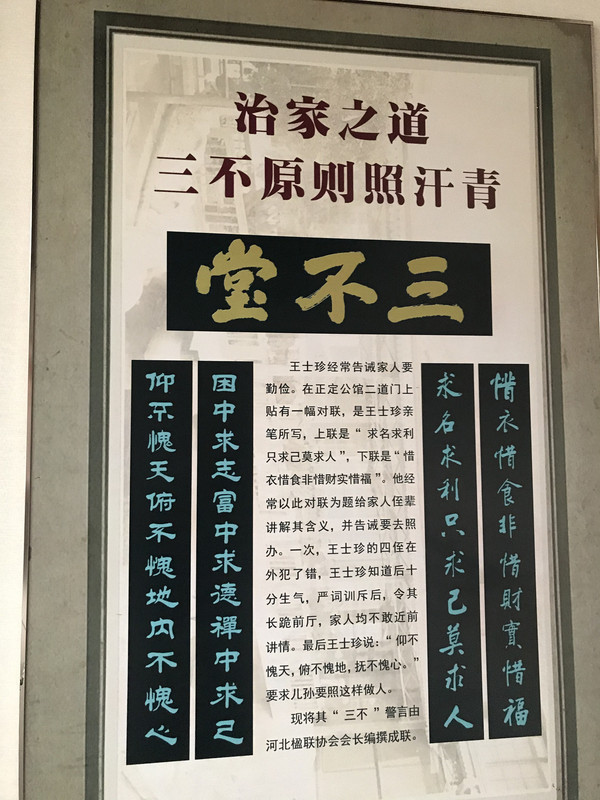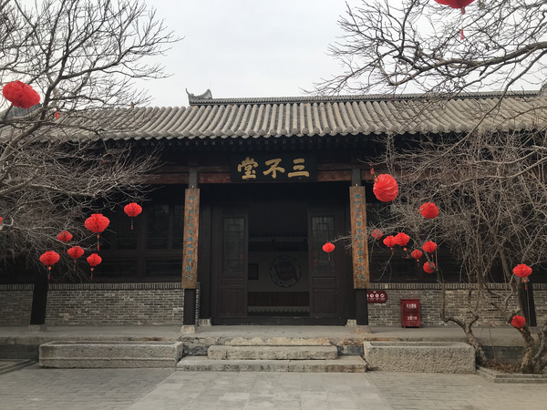 第二个院落正中是三不堂,正房门两侧柱子上一副对联令人深思:“困中求志富中求德禅中求己,仰不愧天俯不愧地内不愧心”,横批“三不堂”。