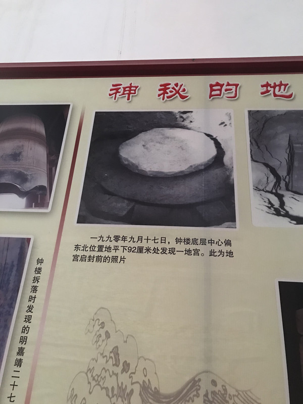 在建筑地面中央的钟池中意外发现了地宫。放在里面的石字母和唐代钱币为钟楼的建筑年代提供了确凿的证据。还发现了唐、五代、北宋、金、元、明、清等7个历史时期的连续文化层叠压,共出土跨越唐至明清时期的瓷器、陶器、石器等器物近2000件。