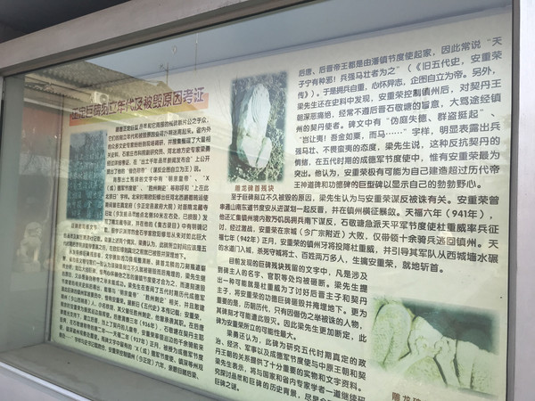 安重荣,山西朔州人,后晋时任成徳军节度使。他镇守镇州(治所在真定,今正定)六年,因不满石敬瑭对契丹奴颜婢膝的妥协政策,在遭遇蝗旱重大灾害的时候,带领饥饿百姓向皇帝请愿,石敬瑭命天平军节度使杜重威征讨,安重荣被擒斩首,真定城被屠2万余人,这通刻满安重荣功德的巨碑也被砸毁并埋于地下。