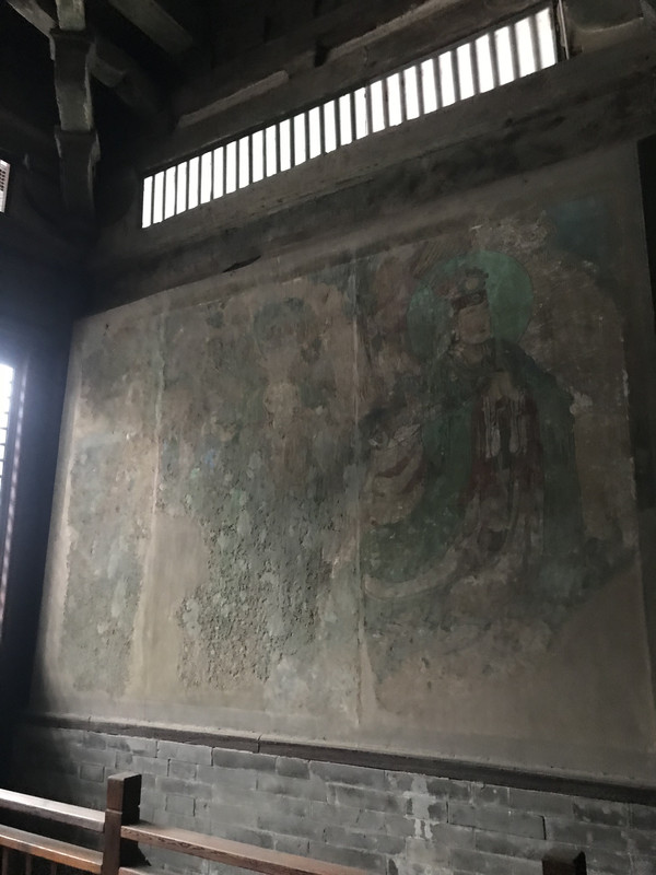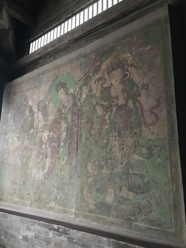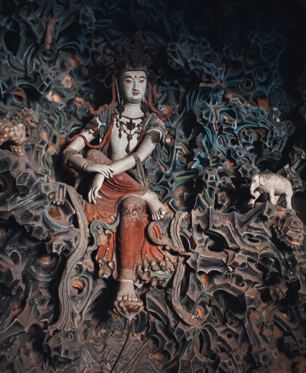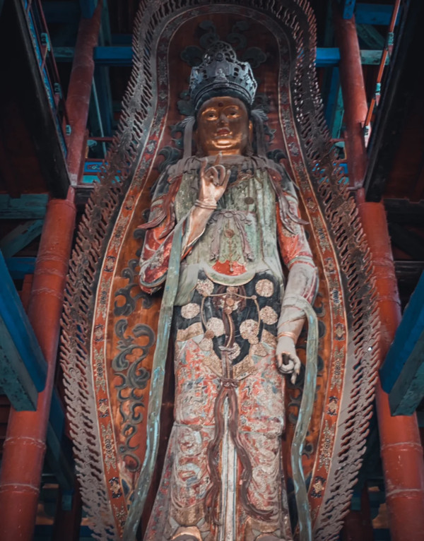 摩尼殿后面,国宝之二,在悬空的五彩泥塑假山中间,有一尊五彩悬塑观音像。鲁迅先生倾倒于这尊佛像把神人化的独特魅力,盛赞其为“东方美神。”