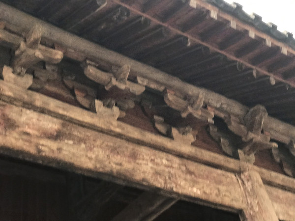 戟门大木构架较为简洁,顶部置平梁,平梁上中立蜀柱,两侧施叉手,梁下高高矗立上下贯通的中柱。柱的南北两侧施三椽栿。栿间仅用短柱,不见驼峰之类的支垫构件,更不用托脚,但栿与柱之间的搭接部位却选用了左右贯通的曲线形雀替,从而大大增强了柱与栿之间节点的横向联结。