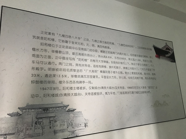 1280年(元至正十七年)《修阳和楼记》写道:“阳和楼者,镇府巨观也。横跨子午之逵”。“每登于斯,南瞰滹水,北瞻恒岳,右挹太行之晴岚,左观沧海之旭日,飘然若出尘世,御天风于九霄之上”。历代帝王官员、文人学士多登楼观景,赋诗题字。