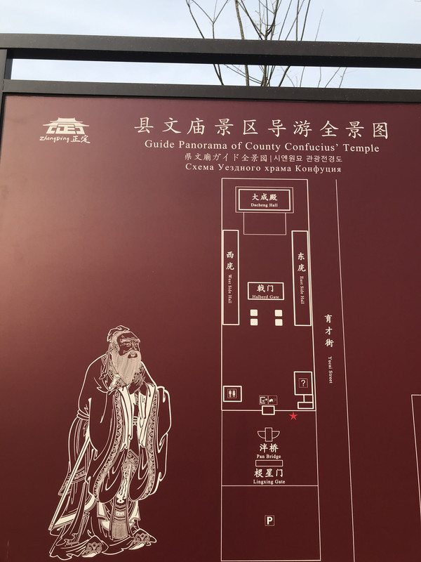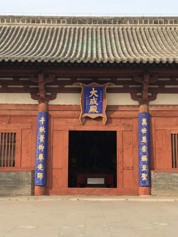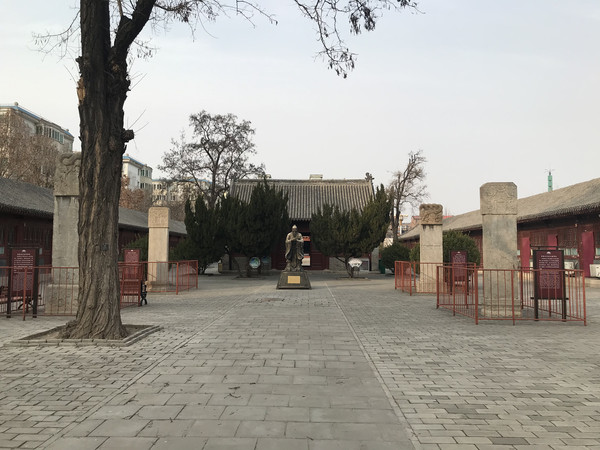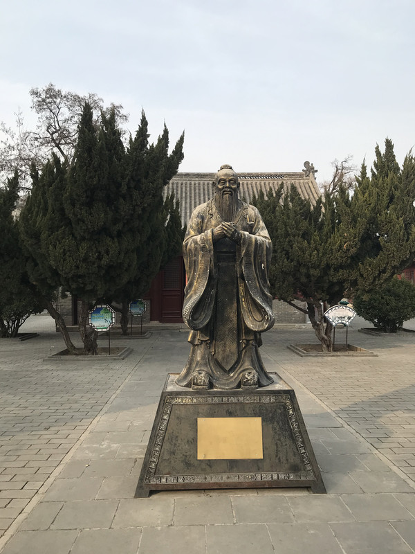 第一个院落为戟门,眼前豁然开朗, 殿前青松翠柏,伫立着孔夫子雕像,和全国所有文庙的建筑规制毫无二致。