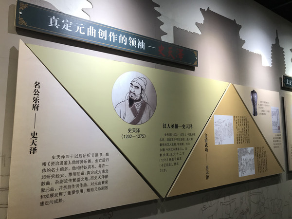 在博物馆内,不仅可以看到与元曲有关的各种陈列,还能见到许多老物件,比如堂鼓、唢呐、笙、中阮、板、京胡、琵琶等,共有十几种乐器。墙上还图文并茂地介绍了中国古代戏曲的发展脉络、元杂剧的剧本形式、五宫四调与曲牌。