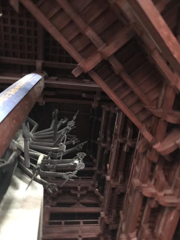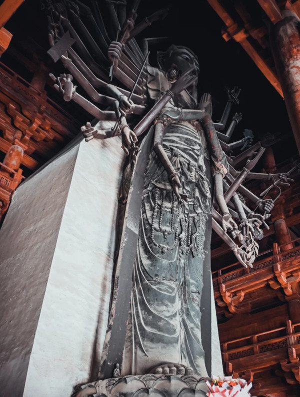 大悲阁中供奉的千手千眼观音菩萨铜像是国宝之五:中国古代最高大的铜铸大佛。非常高大,仰拍都无法收全。是宋代开宝四年(公元971年)铸造的原物。菩萨像高21.3米。 共42臂,除本身的两只手、眼外,在身体左右各有20只手,分别执日、月、净瓶、金刚杵、宝剑等法器。铜像身躯高大,比例适度,其形体之巨、雕工之细实为罕见,是世界上古代铜铸佛像中最高大、最古老的千手千眼观世音菩萨像。
