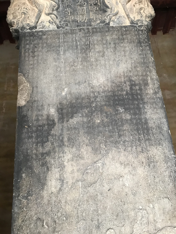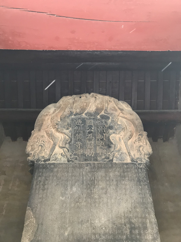 在殿不远处为国宝之四:被推崇为隋碑第一的龙藏寺碑。此碑刻立于隋开皇六年(586年),是隆兴寺内现存碑刻中价值最高的一通。碑通高3.15米,宽0.90米,厚0.29米。碑文正面楷书30行,每行约50字,共1446字。