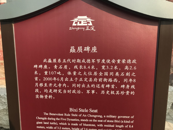据考证,这块巨碑是五代后晋时期成德军节度使安重荣的纪功碑,后晋皇帝石敬瑭敕令太子宾客任赞撰文并刻立“以扬异政”。