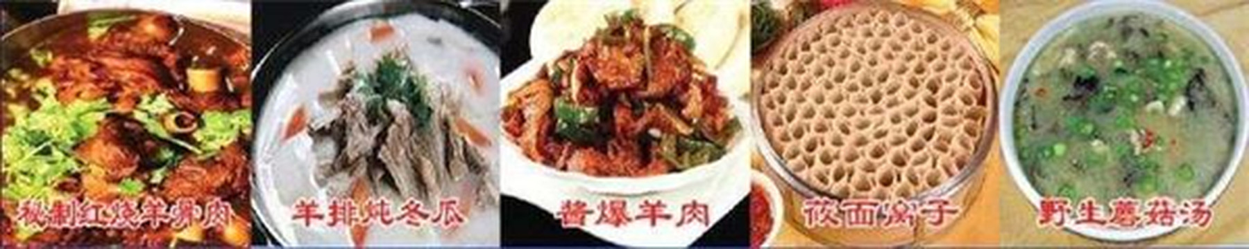 农家特色肉类有: 烤全羊、烤羊腿、烤羊排、烤兔、烤鸡、手扒羊肉、草原清炖兔、柴鸡炖蘑菇、羊杂汤等。