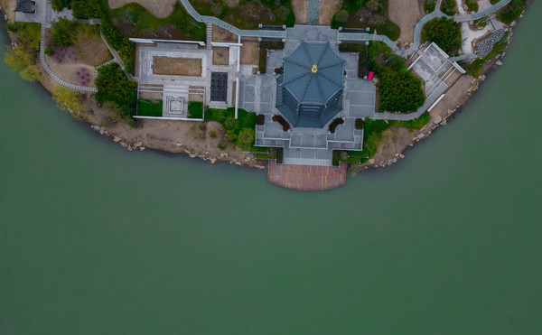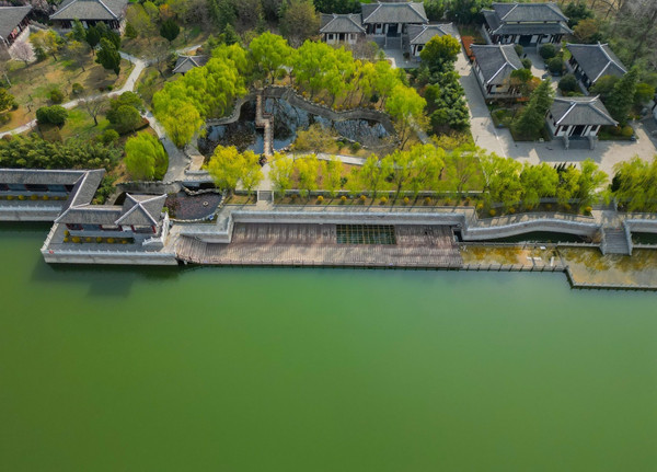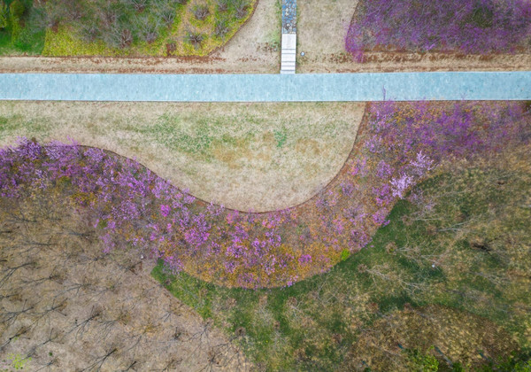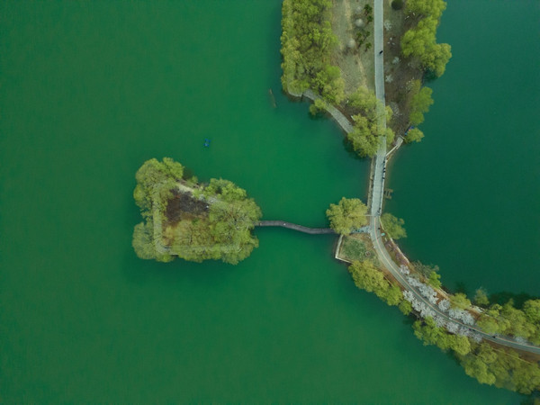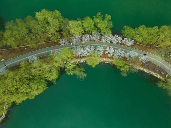 无人机视角下的五柳如同一幅油画一般,碧绿的湖水,水中的小径两旁花树盛放,置身其中,有种一秒入 江南 的既视感。
