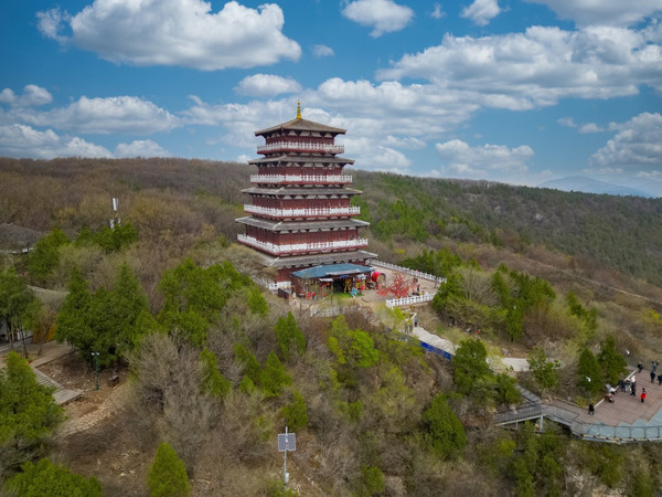 继续往上走到皇藏幻境,可以看到红色的塔和玻璃观景平台。平台可览皇藏峪全景,春天万物复苏,满山翠绿欲滴,微风吹拂,树枝轻摇。
