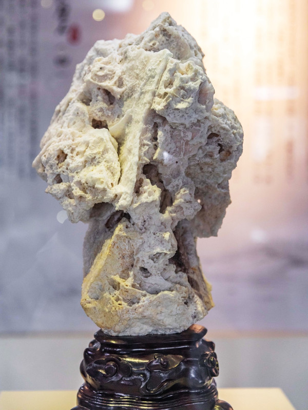灵璧 石质地细腻温润,滑如凝脂,石纹褶皱缠结、肌理缜密,石表起伏跌宕、沟壑交错,造型粗犷峥嵘、气韵苍古,富有韵律感。