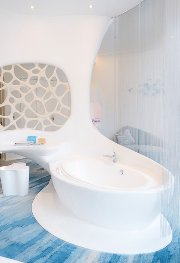 酒店拥有94间极具设计感的客房,均为人造大理石整体成形,墙壁、客床都呈现流水形态,给人非常舒适,非常有利于解压和缓解疲劳。从艺术品陈设到床单用具,设计的巧思遍布每一个细节,处处都是打卡拍照处。