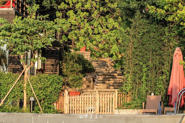 酒店的前台接待处跟同样位于深圳会展中心旁边的皇庭V酒店相比,少了几分都市的时尚感与金碧辉煌,取而代之的是返璞归真感十足的小木屋,在郁郁葱葱的青山绿水簇拥下,充满惬意。