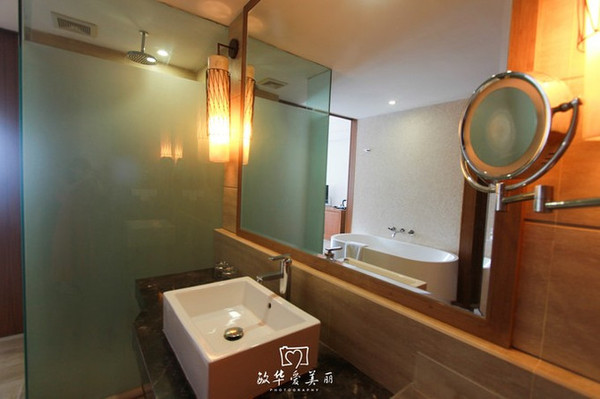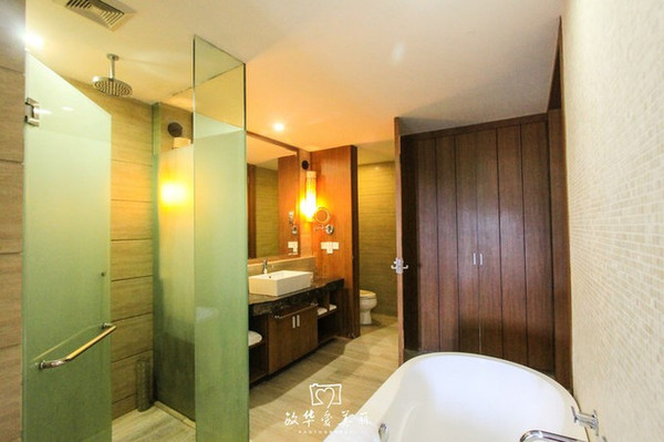 往前走两步,就会看到一个带有浴缸和淋浴房并存的浴室。干净有质感的卫浴设备、独家定制的洗护用品,低调中显露奢华。