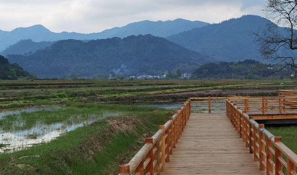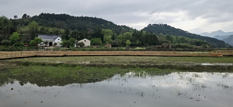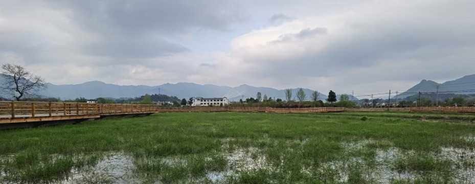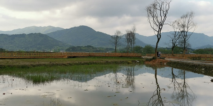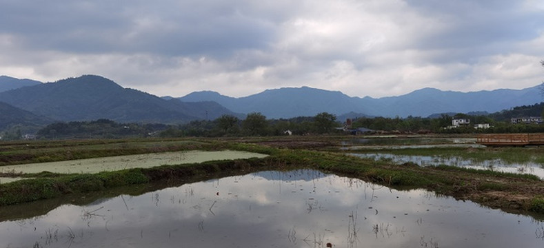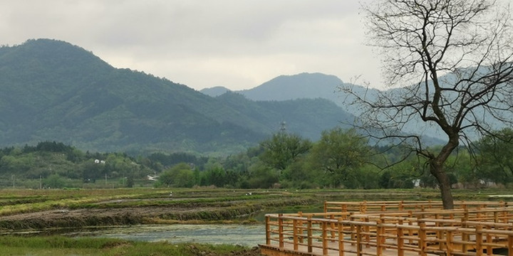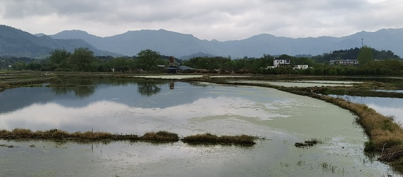 过了云岭镇,经过了皖南新四军军部旧址。再往前,拐进X064县道,一大片水田就出现在道旁。波光清泠,春水平畦。那倒映在水中的远山近树,那远处村庄里的袅袅炊烟,不就是“暧暧远人村,依依墟里烟”吗?