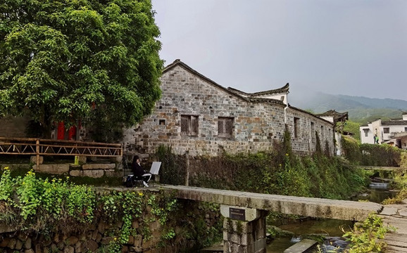 许溪,村中的一条主溪,自西向东流过查济。在扁官巷口,许溪折向北,形成了一个拐弯。在这里,有一座普通的平板石桥连接两岸。巷口人家别出心裁地在自己家的山墙外建起了半座小亭。远远望去,小亭仿佛盖在桥上,亭檐翘起,凌空欲飞,为这座平平无奇的石桥平添了几分俏丽。