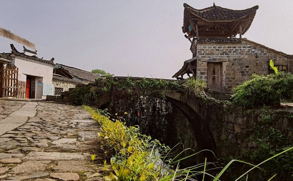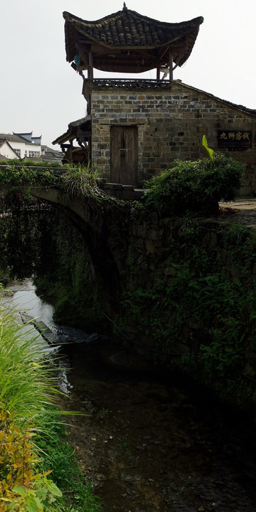 沿许溪慢慢前行,一座石拱桥映入眼帘。桥的上面竖着一道徽式的马头墙,这种样式比较少见。墙上写着紫气东来四个大字。溪水北岸,一株大树荫庇着这座石桥;南岸,紧挨着马头墙的小路上,有一座二层的木牌楼。这是财神楼,上面有一座供奉着财神的小神龛,面向东方——太阳升起的地方。这座小小的神龛寄托着全村人对美满富足的希望。