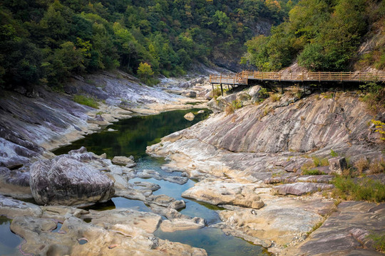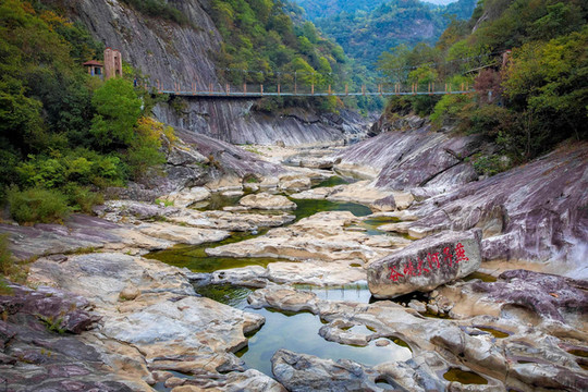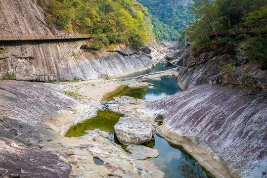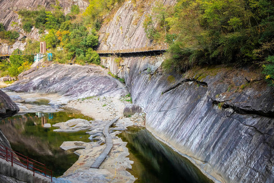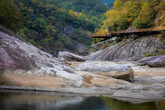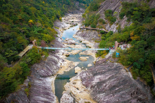 峡谷内不仅有怪石嶙峋,峡谷两侧的树木将这里营造出了一个天然的森林氧吧,走在峡谷两旁的栈道上,空气中飘着草木清新的气息,陶醉在美景中,眼前既有怪石叠嶂的壮美,又有漫山的充满色彩的秋日美景,俨然一处引人入胜的仙境。