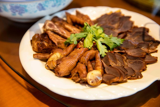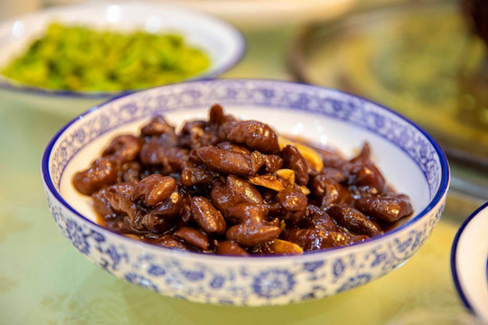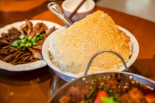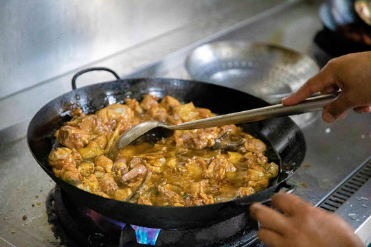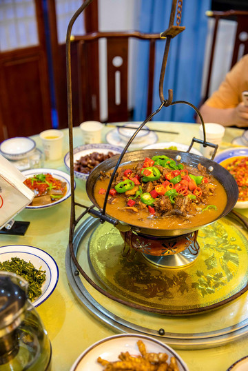 在天堂寨的黄山大饭店,点了一锅吊锅土公鸡,先是用酱料腌制,再下油锅将鸡肉炸香,最后在用小火慢炖,一道看似简单的吊锅土公鸡却融合了金寨人无穷的智慧和想象力,曾经的吊锅是在在屋子的正上梁上悬挂木质滑杆,吊上一个铁锅,在火笼上可随意升降,如今吊锅走入饭店,虽没有从前那么繁琐的过程,但这道菜依旧是金寨人餐桌上的人情冷暖。